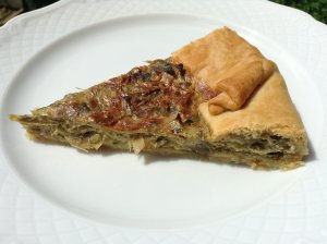 Scaldare in tre cucchiai di olio l'aglio ed aggiungere subito i cuori di carciofi puliti (privati dalle foglie dure, dalle barbe interne, tagliati a fettine) e il prezzemolo. Cuocere per 15 minuti a fuoco moderato, regolare di sale e pepe e aggiungere poca acqua se necessario. Assaggiare il punto di cottura dei carciofi e se sono abbastanza teneri toglieteli dal fuoco e metteteli in una ciotola. Aggiungete la ricotta, il formaggio, le uova, sale e pepe se necessita e amalgamate bene. Srotolate la pasta brisée e foderate una tortiera lasciando sotto la carta da forno, in questo modo non serve ungere il recipiente. Versate il composto di carciofi, lisciatelo pareggiando la superficie e rivoltate il bordo sopra il ripieno. Infornate in forno ventilato a 175 gradi per 40 minuti circa, la torta deve risultare dorata. Si può servire sia tiepida che fredda con contorno di trevisano tardivo e rucola conditi al balsamico.